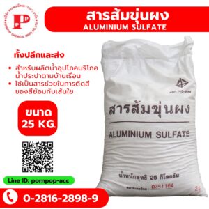 คำอธิบาย อะลูมิเนียมซัลเฟตในรูปแบบผงมีข้อดีคือสามารถละลายน้ำได้เร็วกว่าแบบก้อน ทำให้สะดวกในการเตรียมสารละลายสำหรับใช้ในระบบบำบัดน้ำ โดยมีคุณสมบัติในการลดประจุลบของอนุภาคแขวนลอย, สิ่งสกปรก, และสารอินทรีย์ต่างๆ ในน้ำ ทำให้เกิดการรวมตัวกันเป็นตะกอนขนาดใหญ่ (floc) ที่สามารถตกตะกอนหรือถูกกรองออกได้อย่างมีประสิทธิภาพ